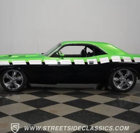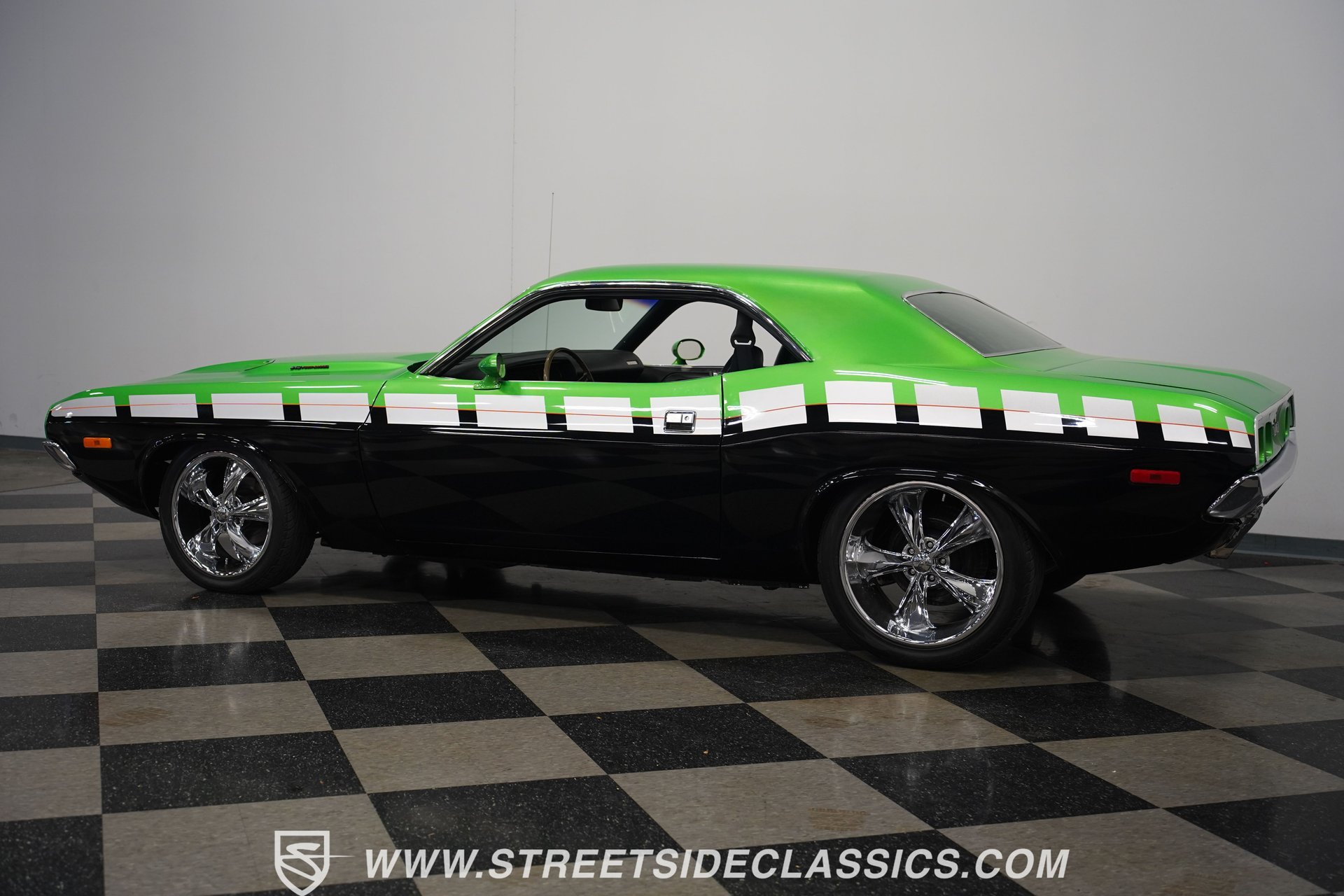 Taking street domination to a new level, this 1974 Dodge Challenger wears an authoritative two-tone paint scheme featuring a deep green primary color accented by menacing black sections and silver racing stripes. The aggressive visuals continue with a muscular stance achieved through staggered Foose wheels - 18-inch diameter up front and massive 20-inch wheels in the rear, fitted with performance-rated 225/45ZR18 front and 275/40ZR20 rear tires. The refined body lines flow seamlessly from the iconic front grille to the signature rear taillights, while gleaming chrome bumpers punctuate both ends. This E-body's visual impact amplifies its street presence through expert craftsmanship and attention to detail.