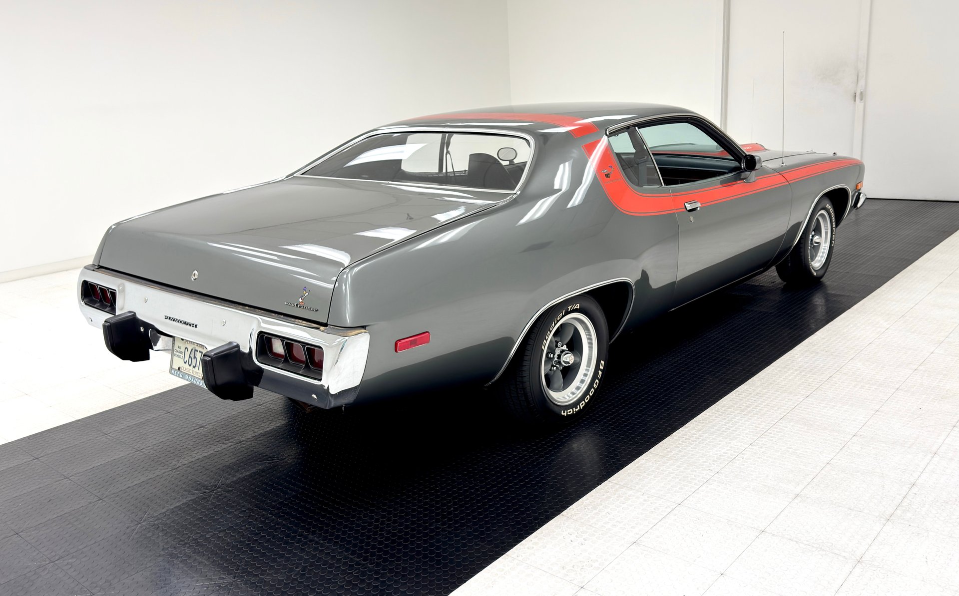 Repainted in a unique combination of two stage Silver Frost Metallic and dramatic stripes that include a wide, red stripe that transversely crosses the roofline, visually connecting the C-pillars. Of course, what would a Road Runner be with the cartoon bird, which makes a presence on each C pillar as well. Back up front, wide set quad headlights flank a black egg crate grille that fronts the bulging hood with hood pints and faux vents and 360 expressed in the red accent stripe. In back, the low slung chrome bumper houses three part tail lights in black bezels and exhaust tips emerge just under the bumper guards. 15-inch American Racing Torque Thrust wheels, gray with silver rims, are a nice touch here and 215/65R15 are all around. Overall, the paint and metal are in good shape but there are various areas of bubbling and peeling from the rust underneath it along with some paint mismatch.