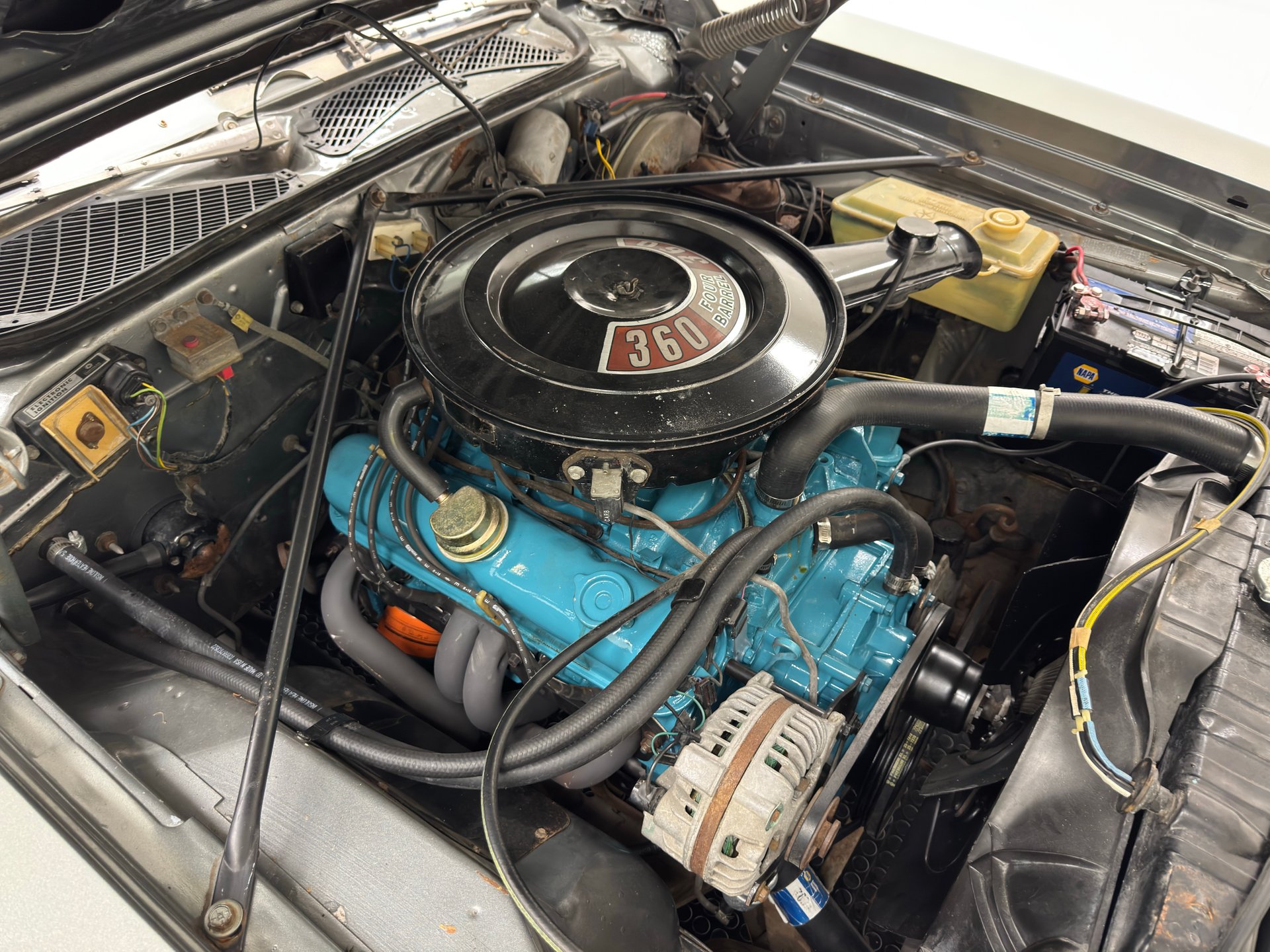 And there it is, clean and blue, the numbers matching 360ci V8, rated at 245 horsepower and fueled by a 4-barrel carburetor. Behind it, the numbers matching A727 Torqueflite 3-speed automatic transmission routing power to the 8 ¾ inch rear with 3.23 gears. The blue block and valve covers stand out in an otherwise clean, driver quality engine bay. A newer fuel pump, water pump, battery, and tune up items are on board.