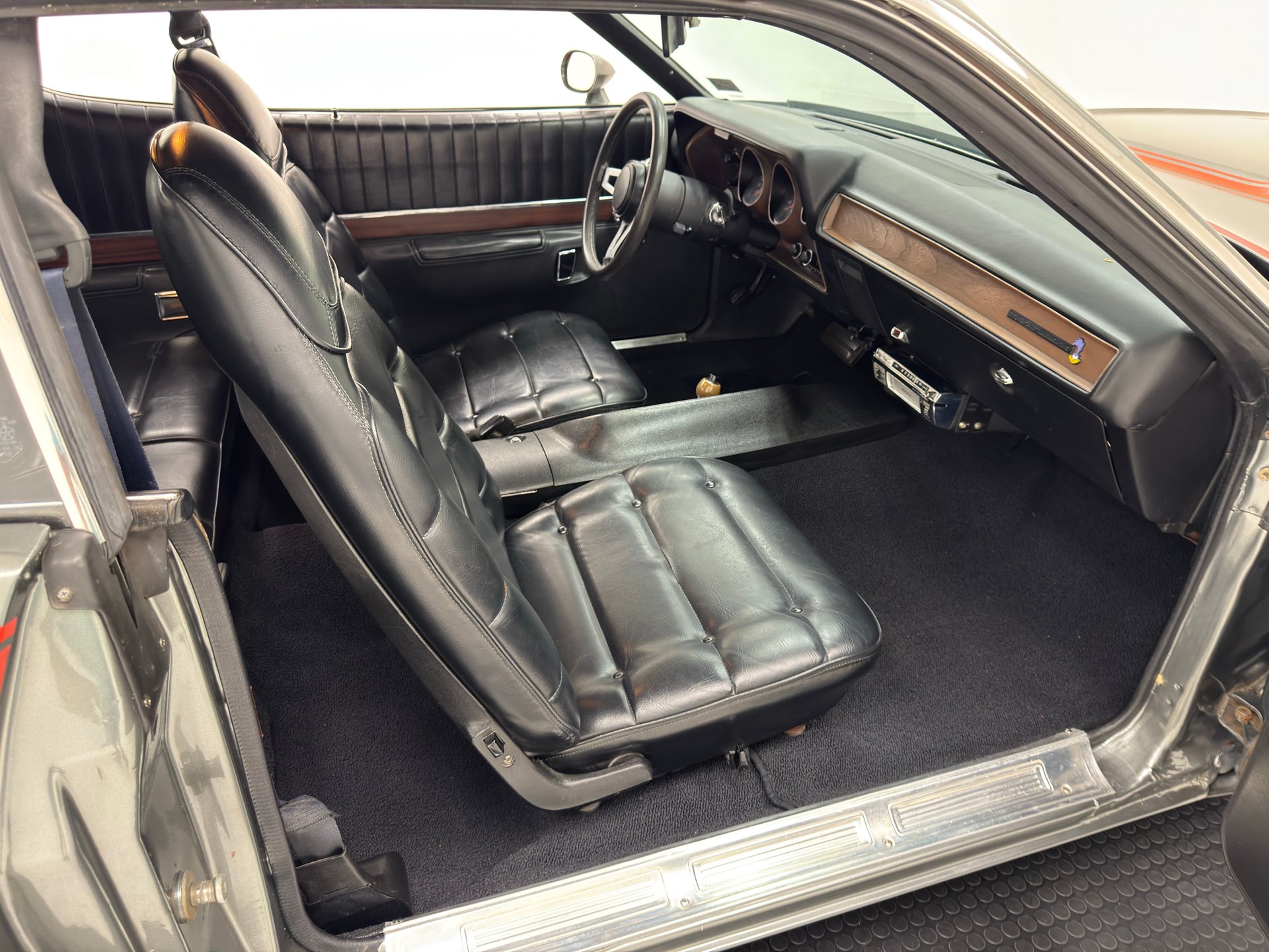 Black vinyl door panels start with vertical stitching and end with smooth coverage below a band of faux woodgrain trim and both doors are in nice shape. Button tufted bucket seats are also black vinyl and piped in the same, rising tall to form an integrated head restraint. Both seats are in very good condition and the back bench is excellent and part of a completely white space, save for the wood trim that continues to the side walls. The three spoke steering wheel leads to the dash where a woodgrain colored plastic base houses black faced gauges extending to the right as well as an AM radio. To augment the radio, an Audiovox AM/FM/8 track player has been added under the dash. The shifter resides in the center console which, like Mopars before it, presents a decorative wall on the passenger side of the console and plenty of woodgrain at its base. Below it all, loop style black carpet covers the floor and looks good, and the black headliner is intact with the occasional discoloration. A fitted vinyl mat is in the trunk and shows some usage.