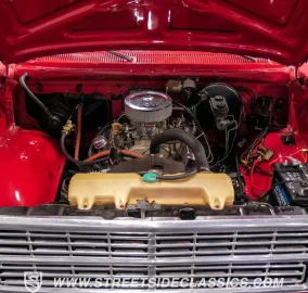 The engine bay houses a 360 V8 engine with an RV cam, a significant upgrade from the original 318. An Edelbrock 4-barrel carburetor feeds the engine while the A727 Torqueflite 3-speed automatic transmission handles gear changes. Power steering eases maneuverability, while power brakes with front discs provide stopping power. A Flowmaster dual exhaust system completes the powertrain upgrades and the suspension features coil springs with shocks up front and a solid axle with leaf springs and shocks in the rear.