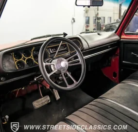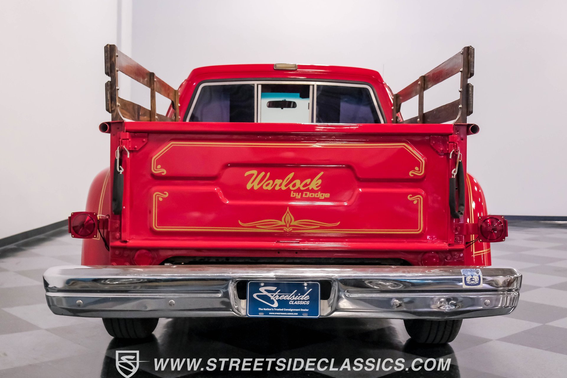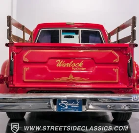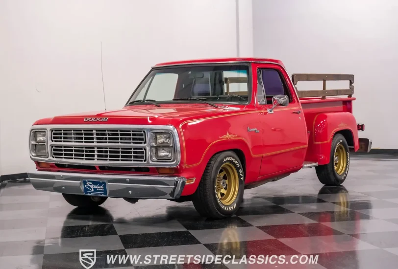 This 1979 Dodge D150 Warlock Tribute showcases a bold red paint job. Gold decals adorn the body, paying tribute to the iconic Warlock design. The truck rolls on 15" gold-painted rims wrapped in Avenger G/T 235/70R15 tires. A real wood bed adds authentic utility, while a sliding rear window and new front bumper complete the exterior upgrades. This D150's transformation from stock to custom creates a unique blend of classic truck styling and modern flair.