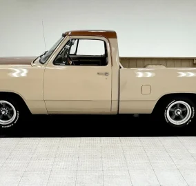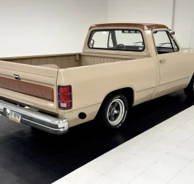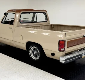 For consignment, a 1984 Dodge D100 short bed pickup showing 76,811 miles, but the true miles are unknown. Born with a slant six, this baby now houses a 318ci V8 with a 4-barrel and hunkers down over Torque Thrust wheels.