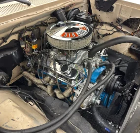Brown and beige is the logical inside palette that begins on the door panels which gives a slight rugged vibe and has the patina to back it up, but both are fully intact. The brown vinyl bench is in immaculate condition, accented by beige seat belts and facing a wood rimmed steering wheel with three spokes and a glossy finish. Up front, the standard instrument cluster is backed by simulated wood and augmented by a trio of Sunpro gauges in the center and a tachometer perched on the dash. A Sony AM/FM/CD player rocks the tunes and talk radio, and a Hurst automatic shifter rows the truck into gear sitting atop a makeshift base. Like the dash pad, the tan carpet below shows a touch of patina but the painted ceiling is clean and the full width rear view mirror gives you a global view of what's behind.