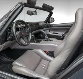 Interior trimmed in gray leather sport bucket seats with full factory center console – minimalist and performance-focused.