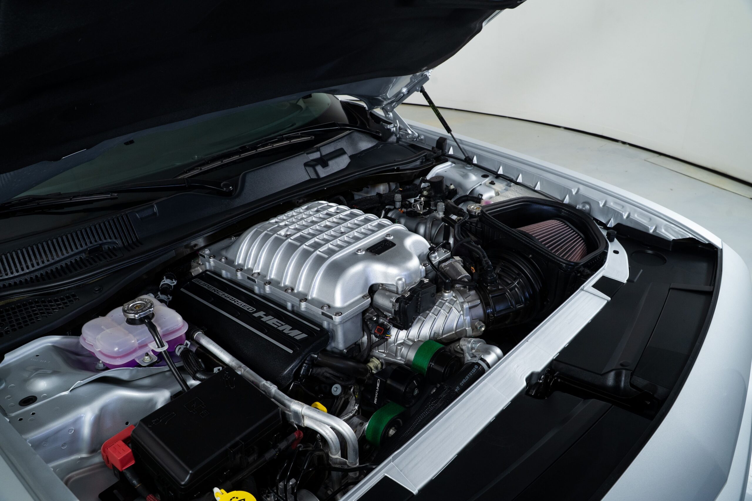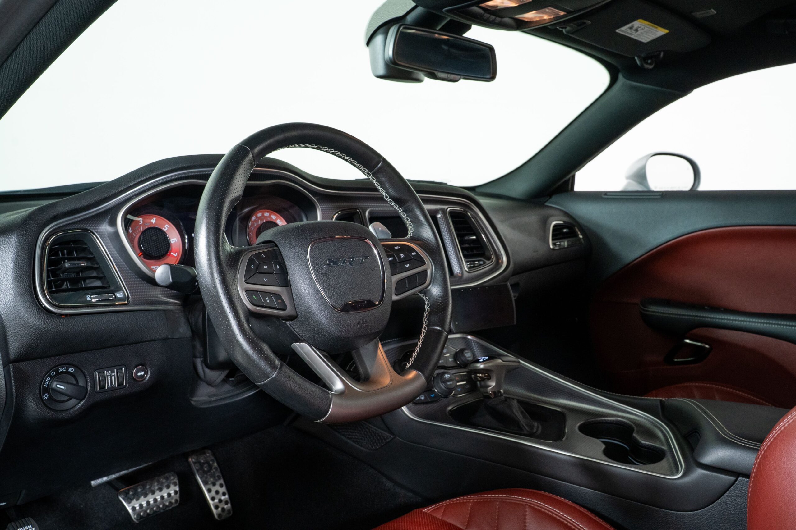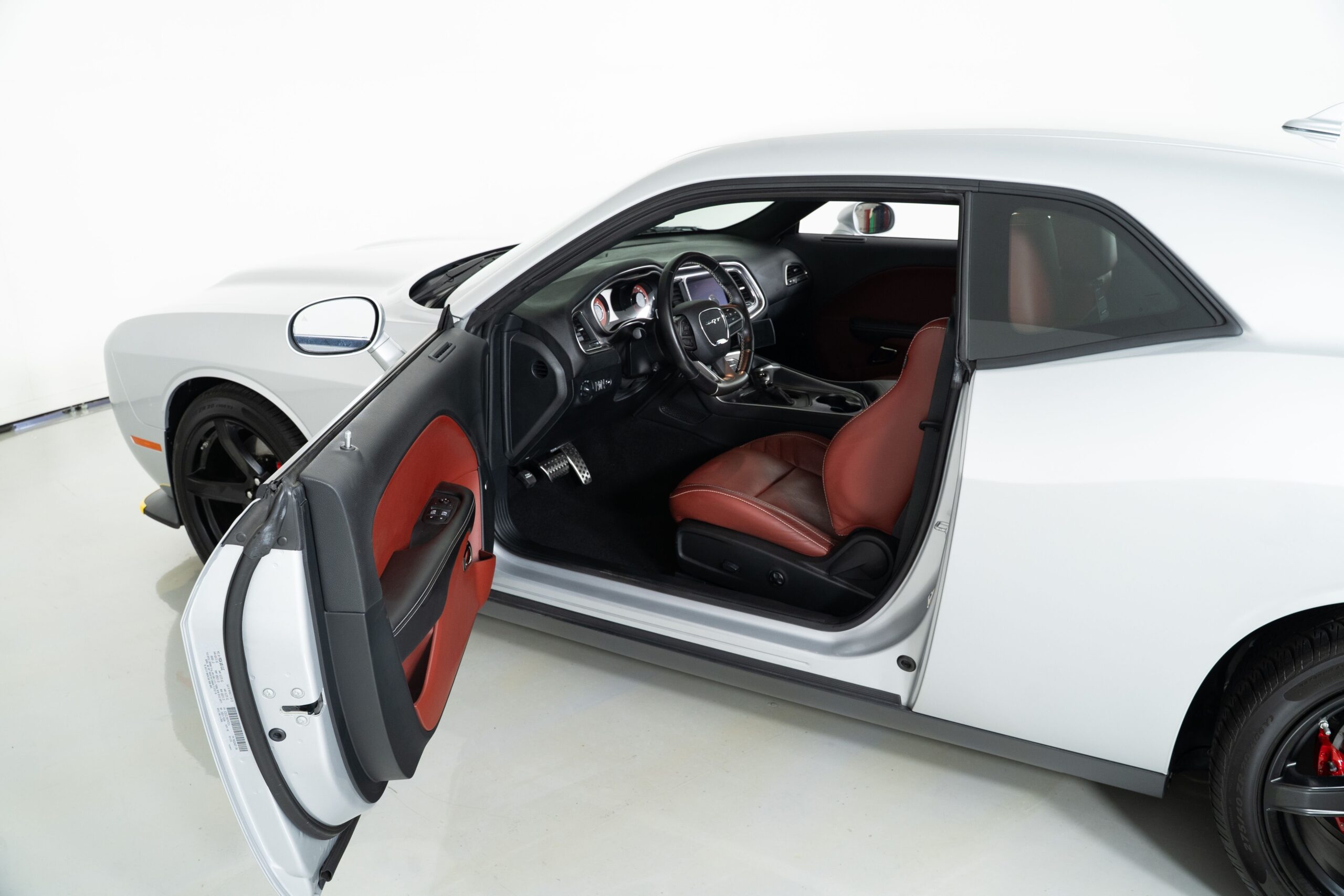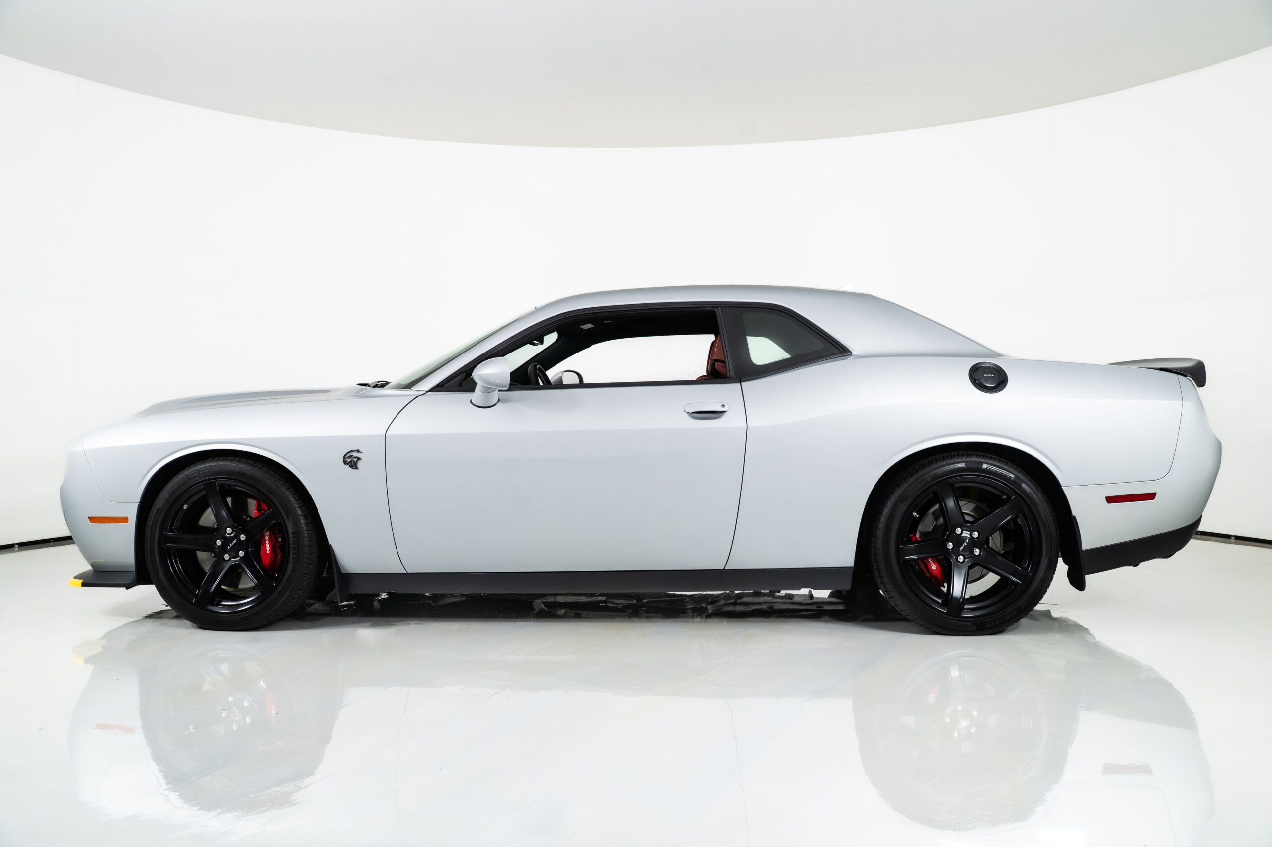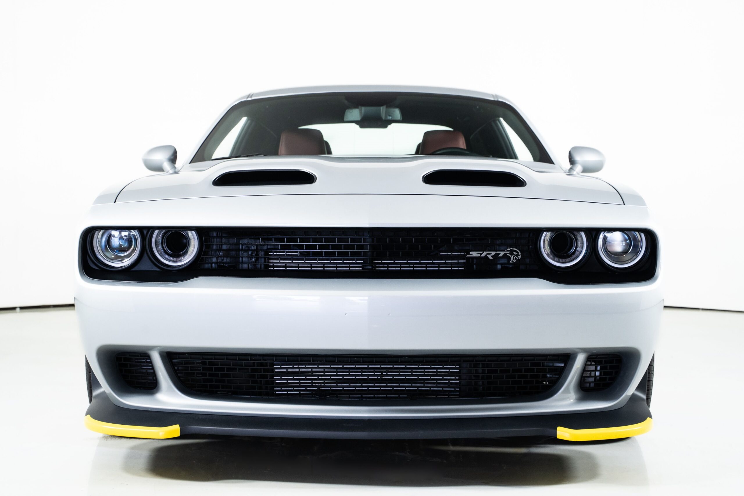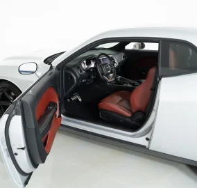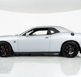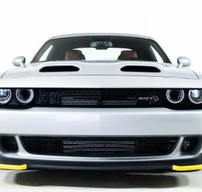 The exterior is finished in Triple Nickel, a sleek metallic silver that contrasts perfectly with the Demonic Red leather interior. The SRT performance spoiler, Laguna Leather Package, and Power Chiller Plus Package add to its aggressive personality and track-ready capabilities. Inside, comfort meets power with the Preferred Package 27Z, bringing premium touches to the cockpit of this Challenger Hellcat.