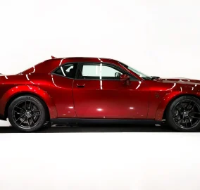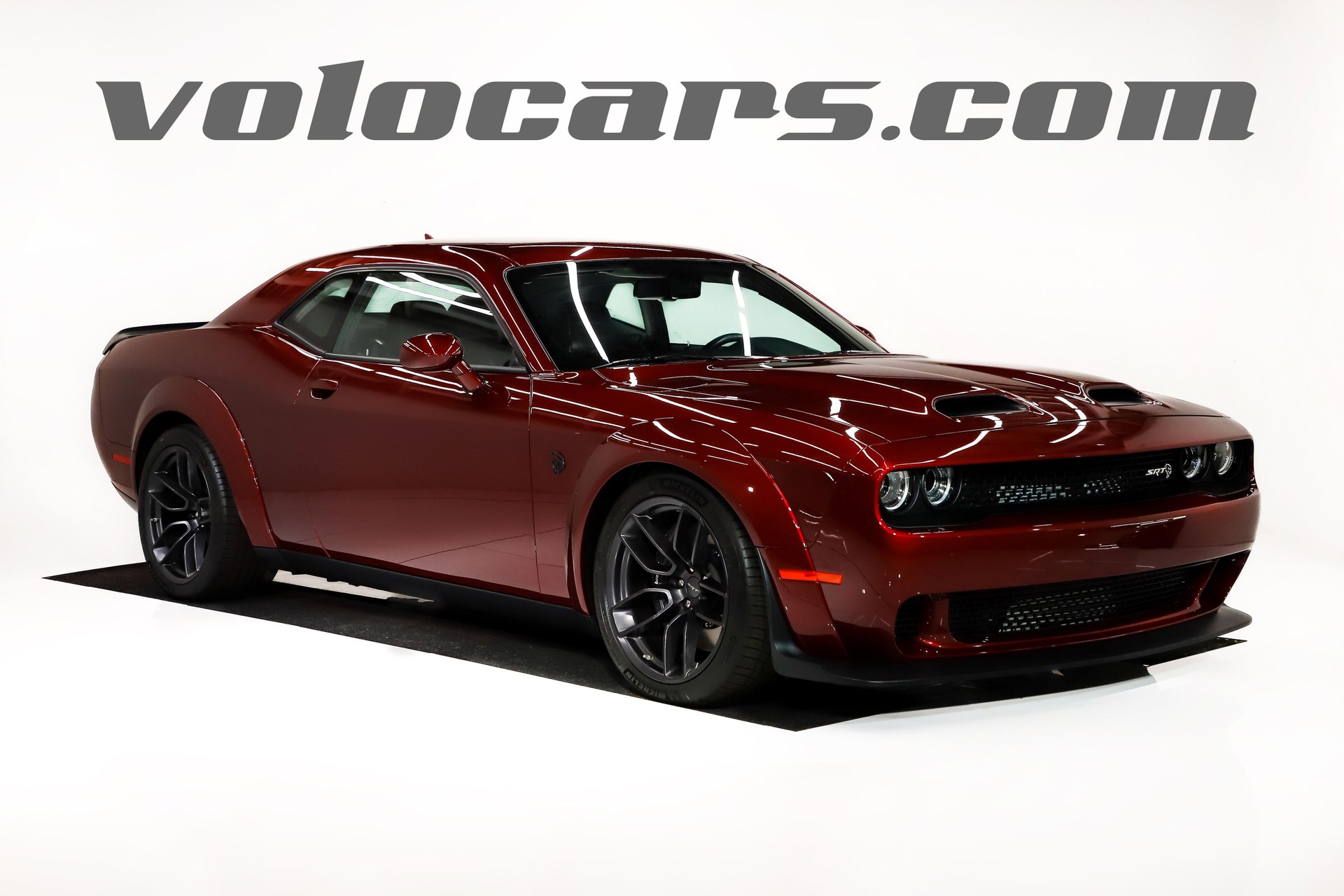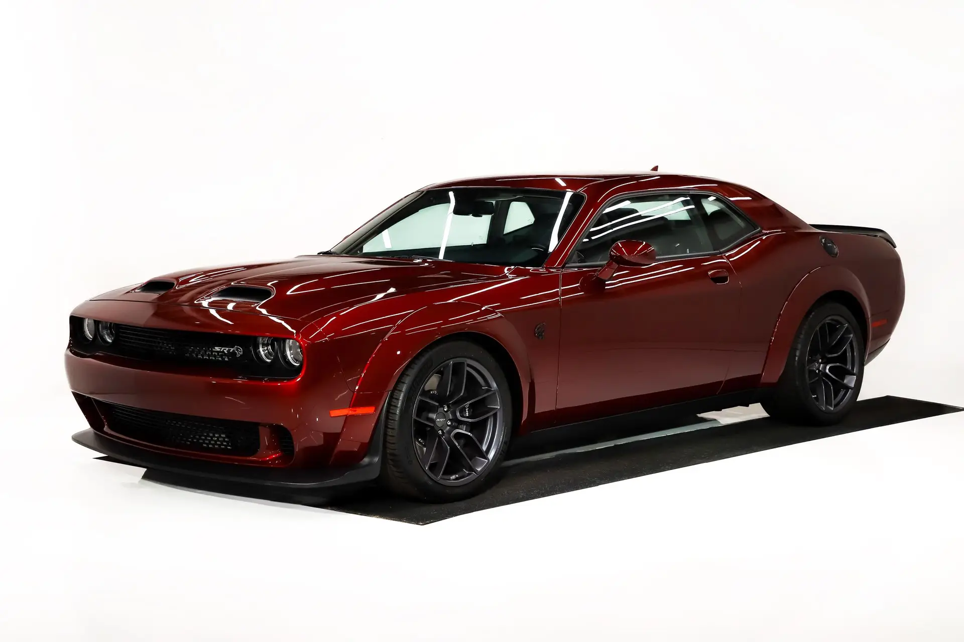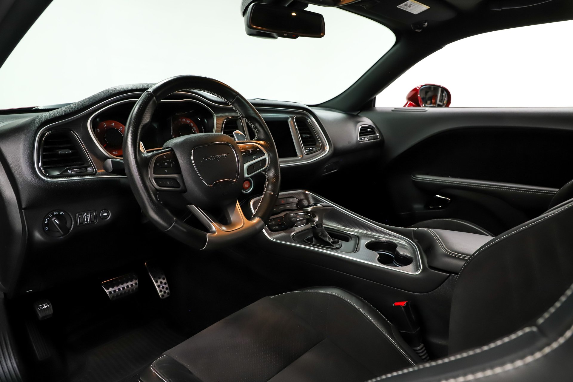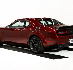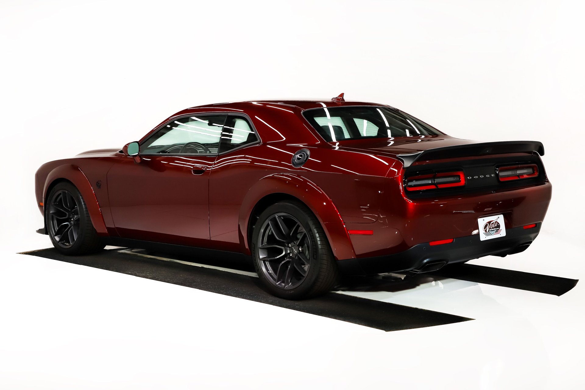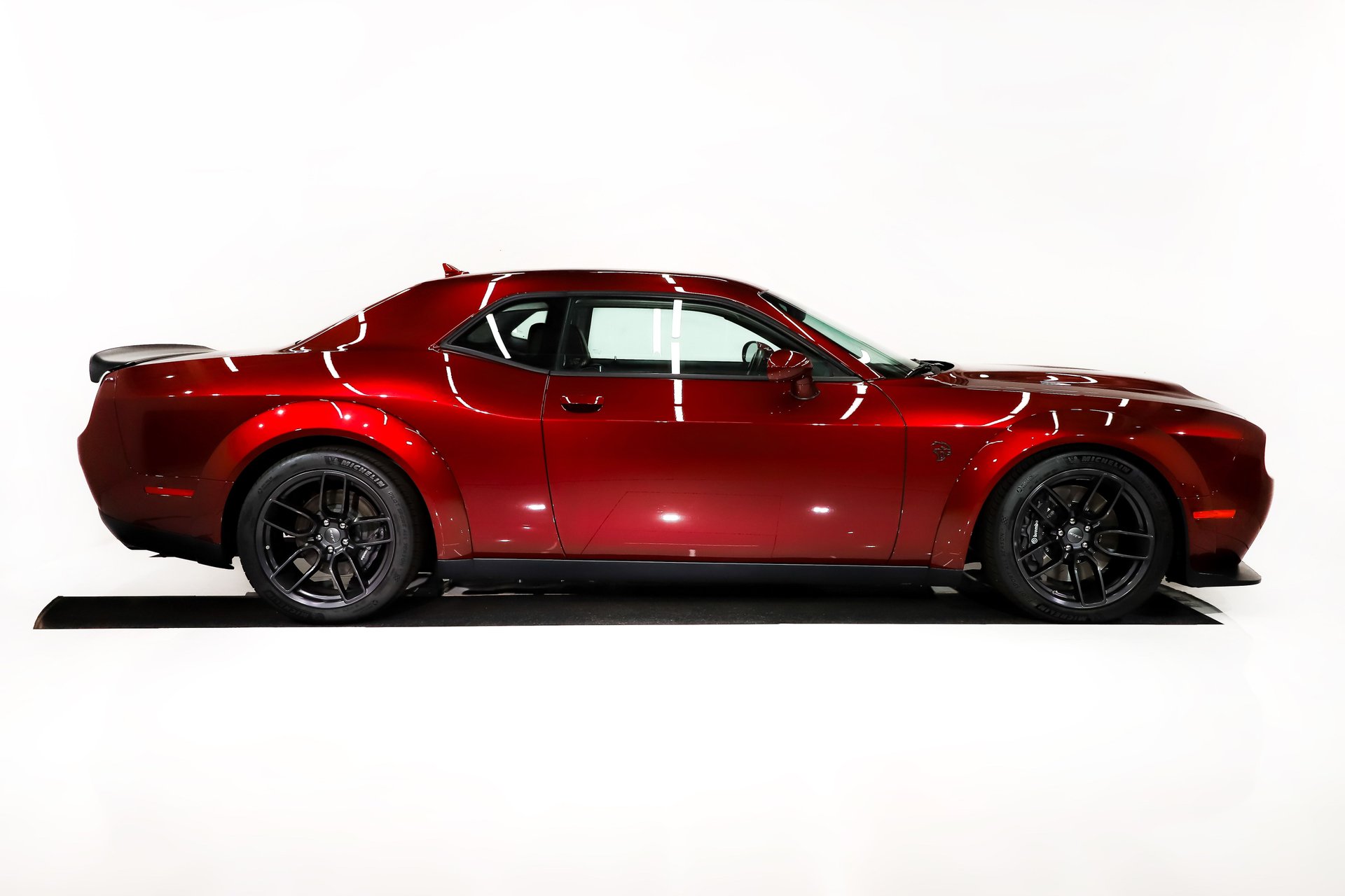 EXTERIOR: You can certainly see the strong resemblance to the original Dodge Challenger. This car presents practically like new, the clean Carfax reflects it has never had any damage or repairs. The red eye includes the twin scoop functional ram air hood and this one has the optional spoilers. It also has the optional wide body package that has flared wheel wells to accompany the extra wide wheels. The color is absolutely gorgeous, like a piece of hard candy called Octane Red metallic. It has a high gloss finish, minor stone chips on the flares. The optional 20x11 inch Devil's rim forged wheels look great. They are wrapped in Pilot Sport All Season performance tires. I also love the modern lighting, the inboard headlights actually act as air induction to the motor. The Hellcat logos even have red eyes representing the Red eye package!