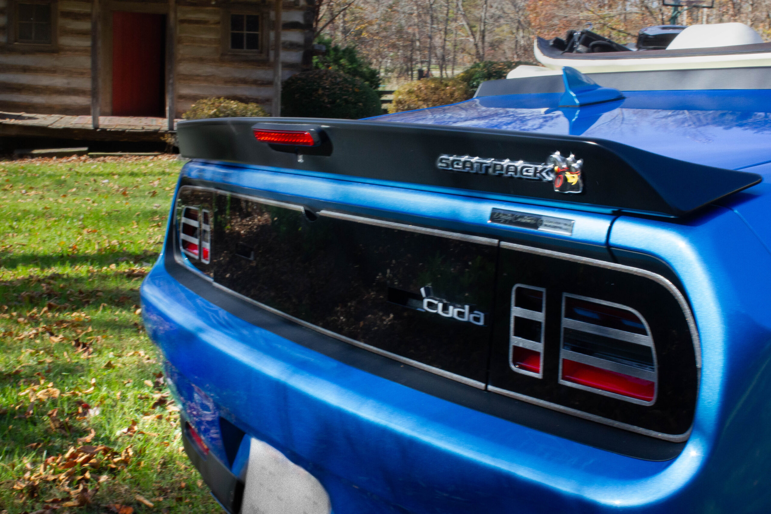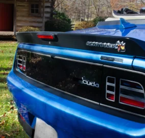 Air-Catcher HID Headlights, a Front Splitter, Widebody Fender Flares, a Satin Black-Finished Rear Spoiler, an Aluminum Hood with Dual Air Scoops, Aftermarket Fender Vents, an Aftermarket Taillight Panel Cover with 'Cuda Badging, and LED Taillights
