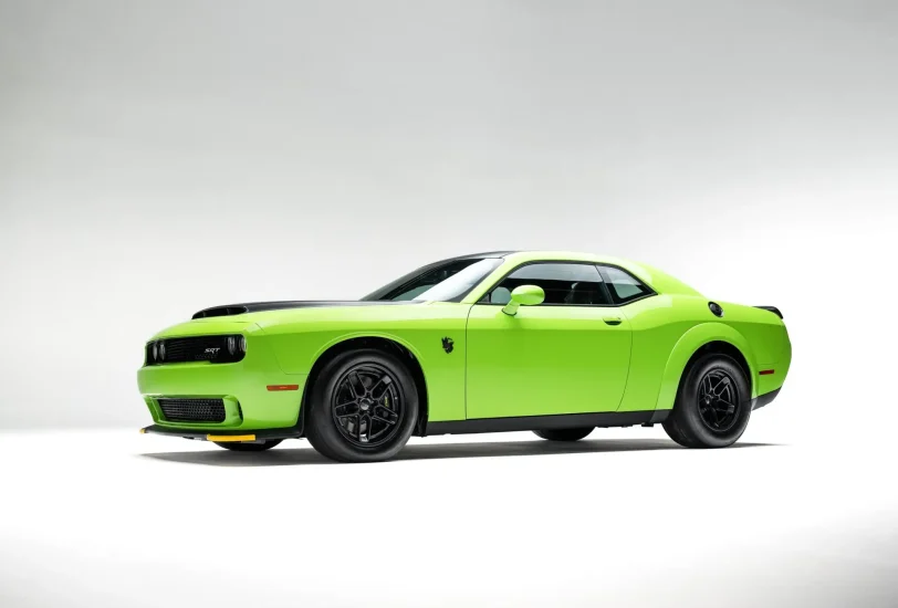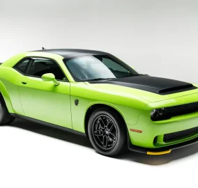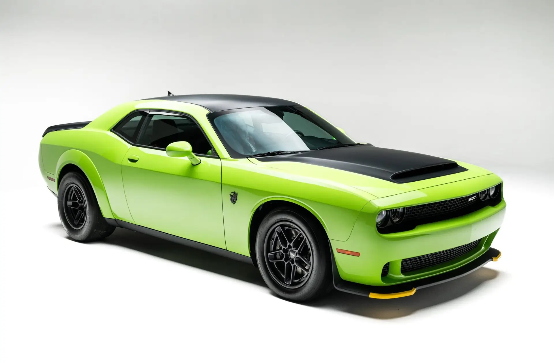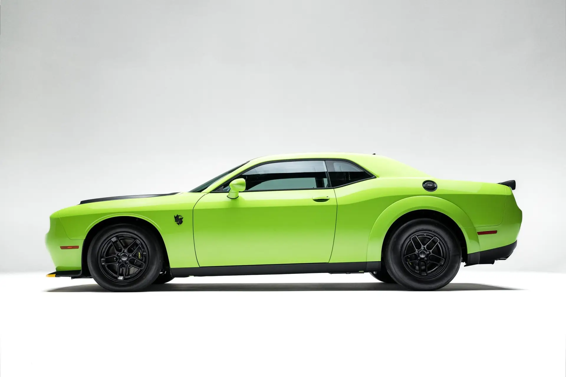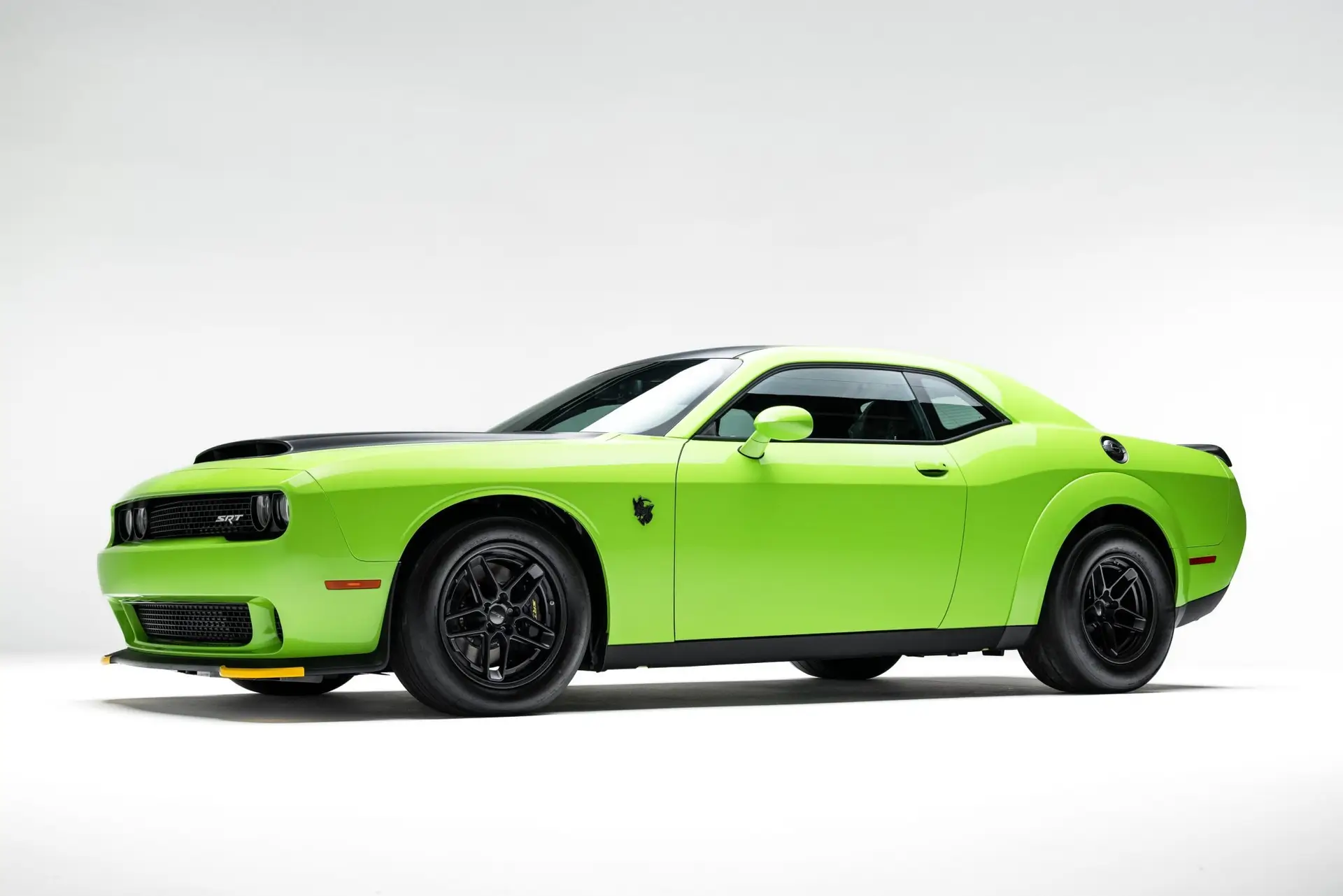 This 2023 Dodge Challenger SRT Demon 170 is #300 of approximately 3,300 examples built for the model year, and it now has 15 miles. The car is powered by a supercharged 6.2-liter Hemi High-Output V8 producing up to 1,025 horsepower and 945 lb-ft of torque, which is sent to the rear wheels via a TorqueFlite eight-speed automatic transmission and a limited-slip differential. Finished in Sublime Green over Demonic Red Laguna leather, the car was optioned without rear seats, and is equipped with Air-Catcher HID headlights, an Air-Grabber hood, a front splitter, an SRT Performance rear spoiler, flared quarter panels, a āLast Callā underhood plaque, four-piston Brembo brake calipers, Lacks Enterprises 18ā³ front and 17ā³ rear carbon-fiber wheels, Satin Black graphics, heated and ventilated front seats, a Harman Kardon sound system, and UConnect infotainment with navigation. Initially delivered to Kufleitner Dodge, this SRT Demon 170 has 15 miles and is now offered on dealer consignment in Illinois with a window sticker, manufacturerās literature, spare parts, a clean Carfax report, and a clean Ohio title.
