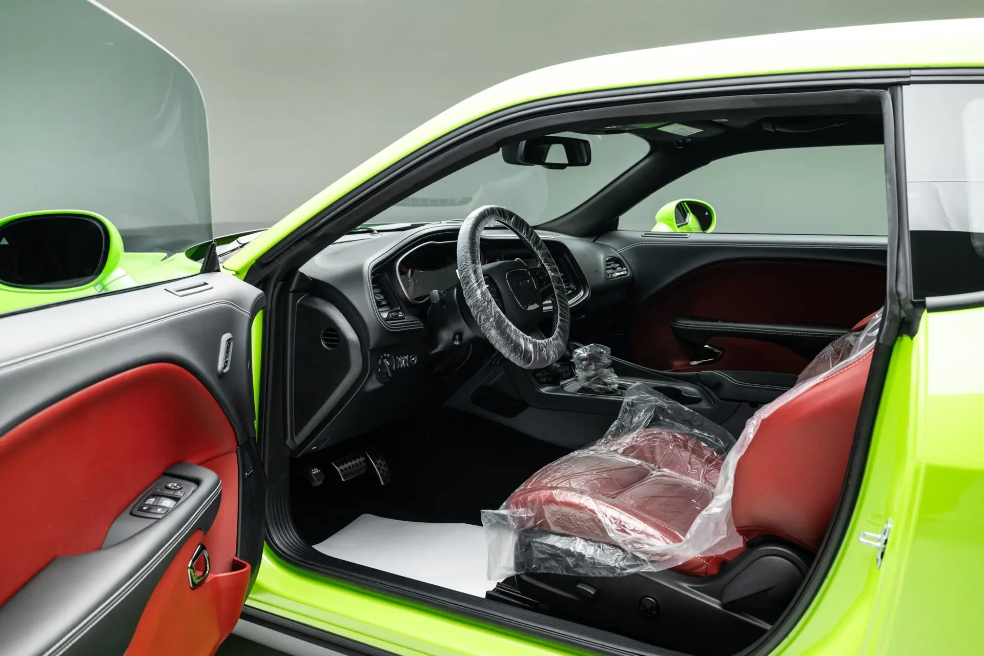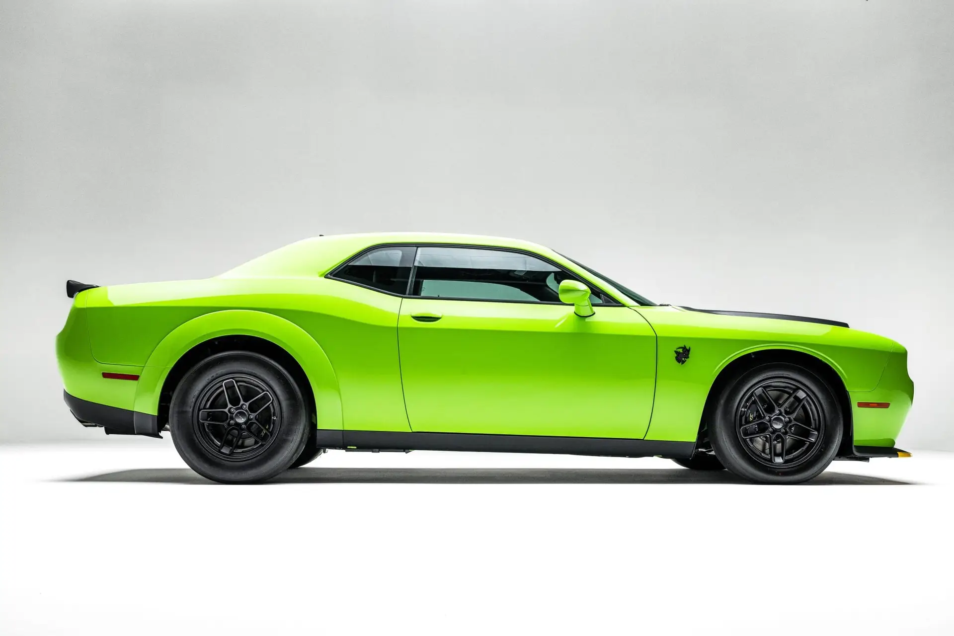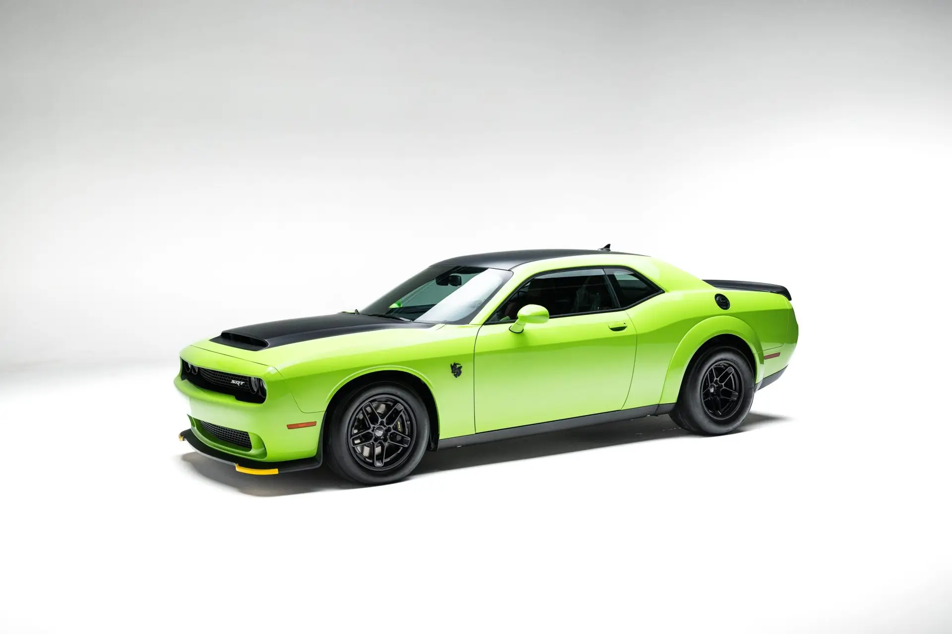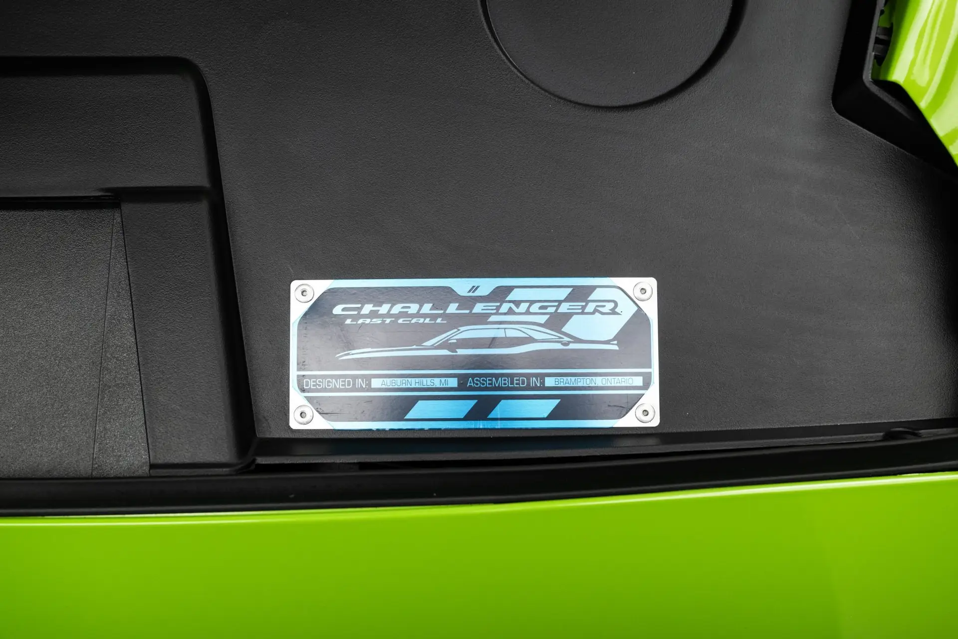 Dodge released seven different Last Call special editions for the 2023 model year to celebrate the end of production of the Charger and Challenger, and the Demon 170 was the final special edition variant. This example is finished in Sublime Green (PFB) and features an Air-Grabber hood with āAlcohol Injectedā lettering on the hood-scoop bezel. Other exterior details include a front splitter that has retained its yellow scuff guards, Air-Catcher HID headlights, flared rear quarter panels, satin black roof and rear decklid graphics, dual exhaust outlets, and an SRT Performance rear spoiler with an integrated rearview camera.