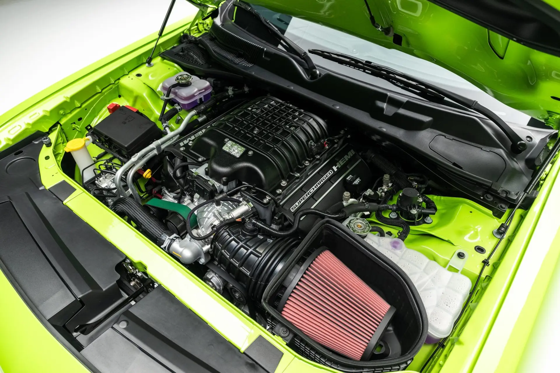 The 6.2-liter Hemi High-Output V8 is equipped with a 3.0-liter supercharger with a 3.02ā³ pulley and a 105mm throttle body in addition to revised fueling system components, Nitride-coated intake valves, copper-lead bearings, and upgraded cylinder head studs when compared to the previous Demon model. The horsepower rating adjusts automatically based on the ethanol percentage in the fuel, and output ranges from 900 horsepower and 810 lb-ft of torque with conventional E10 fuel to 1,025 horsepower and 945 lb-ft of torque when using E85. The engine is also equipped with an SRT Power Chiller, which utilizes the air conditioning refrigerant to cool the air entering the intake ports.
