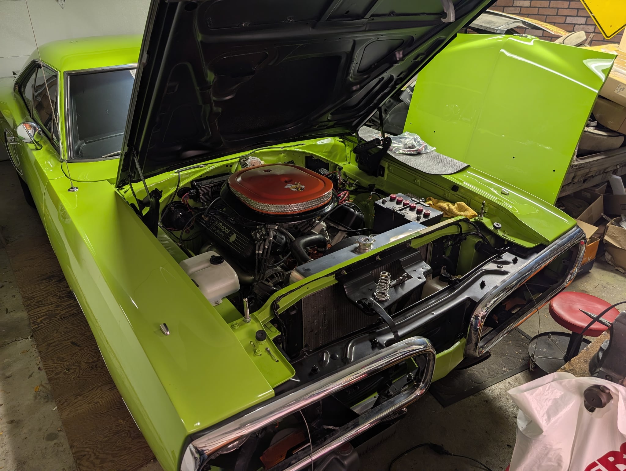 It came with 13 boxes of parts next to the car. The car is originally a Coronet 440 model. The previous owner was going to make it a bracket race car, so it was painted sublime green and made into more of a Super bee tribute car.