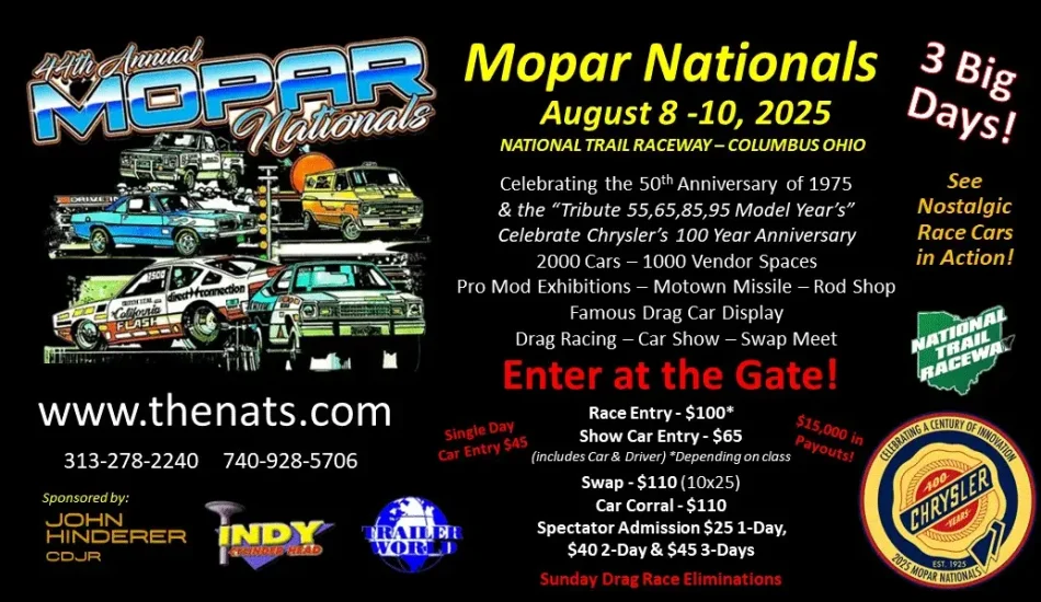 44th Annual Mopar Nationals August 8 -10, 2025 National Trail Raceway, Columbus, Ohio “Celebrating the 50th Anniversary of the 1975 Model Year along with ...